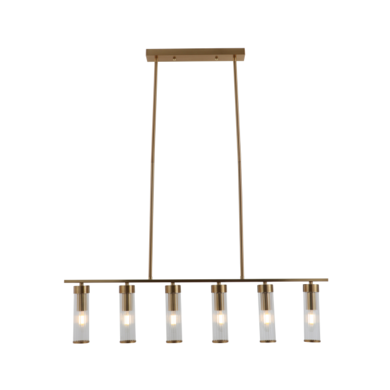 Esta luz colgante de vidrio lineal de altura ajustable de precio al por mayor de una iluminación fuerte presenta una disposición lineal de 6 enchufes de bombilla E14, continuando la filosofía de diseño de la marca de "mezclar arte y practicidad". Los tubos de vidrio rayado a prueba de explosión de luz clara experimentan un tratamiento de fortalecimiento de alta temperatura, ofreciendo una alta transmitancia de luz y resistencia al impacto y altas temperaturas. El marco de hardware de latón cepillado con luz lineal de altura ajustable certificada CE y UL de CE y UL ha pasado una prueba de spray de sal de 48 horas, asegurando un brillo duradero en entornos húmedos y incorporando un estilo moderno de lujo ligero.
