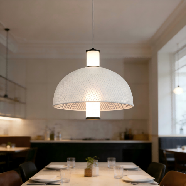 Inspirada en las tendencias de diseño de vanguardia de la exposición Euroluce de Milán de 2025, esta lámpara colgante minimalista de malla de seda italiana de Strong Lighting combina a la perfección el minimalismo italiano con una funcionalidad práctica. La fuente de luz LED central de 15 W emite una luz neutra de 4000 K, creando una atmósfera confortable. Con un brillo de 1500 LM y un alto índice de reproducción cromática de Ra>80, la luz es natural y realista, lo que la hace adecuada para salones, comedores y otros espacios. La pantalla de lámpara redonda en forma de arco está hecha de malla de hierro envuelta alrededor de tela de seda blanca, y los herrajes negros mate están terminados con un proceso de pintura en aerosol para agregar textura. El diseño simple se integra fácilmente en estilos de hogar nórdicos, modernos y otros.